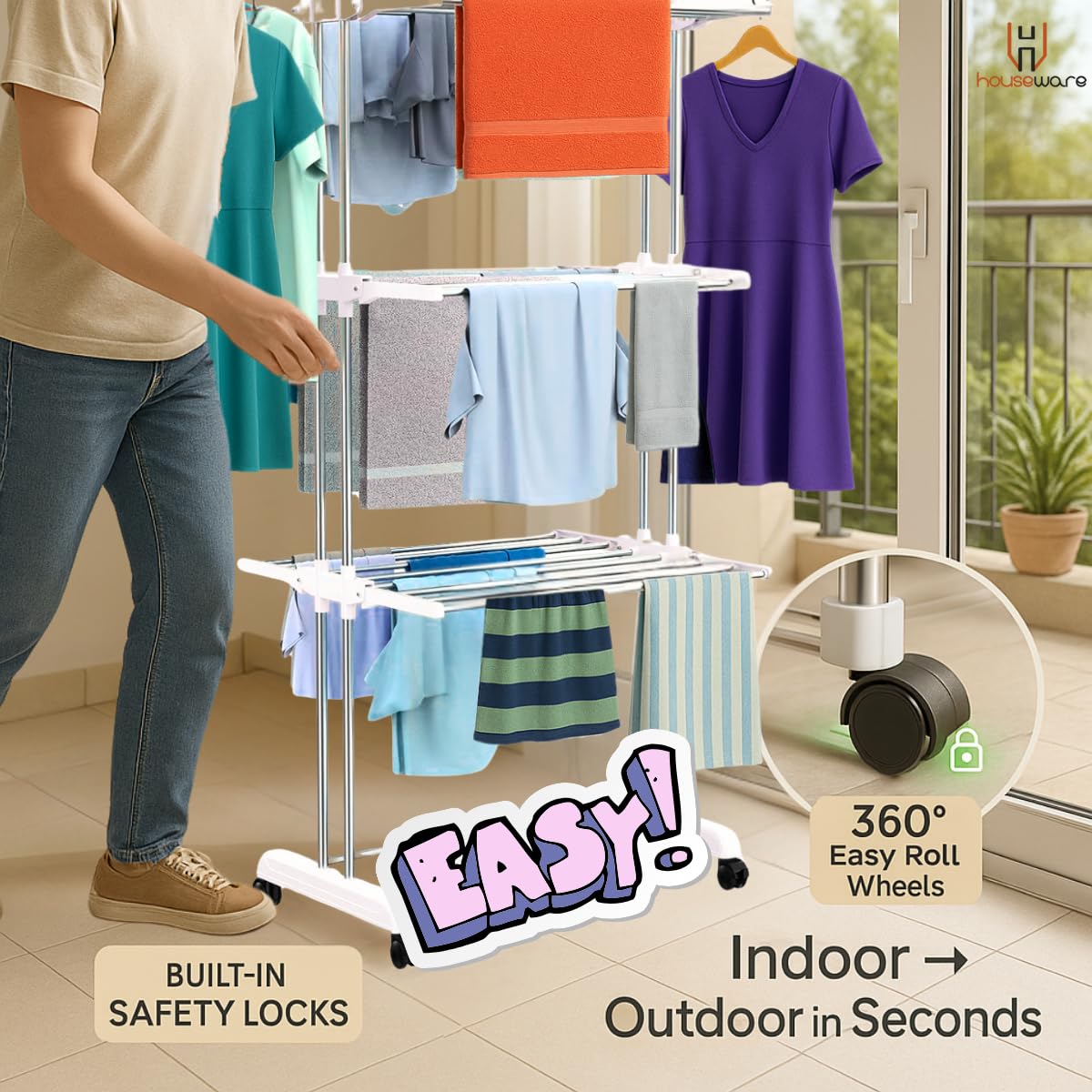 - Stainless Steel Cloth Drying Stand with 3-Tier Space: Offers 58 feet of drying area + 14 hanger slots—perfect for everyday clothes, towels, and even bedsheets.
