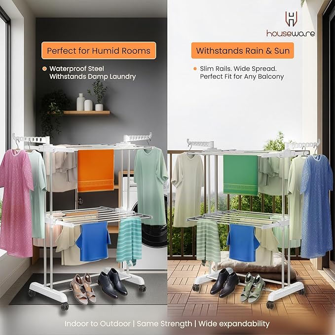 Heavy Duty Stainless Steel 2-Tier Cloth Drying Stand with Wheels | Rustproof & Portable Laundry Rack (White)